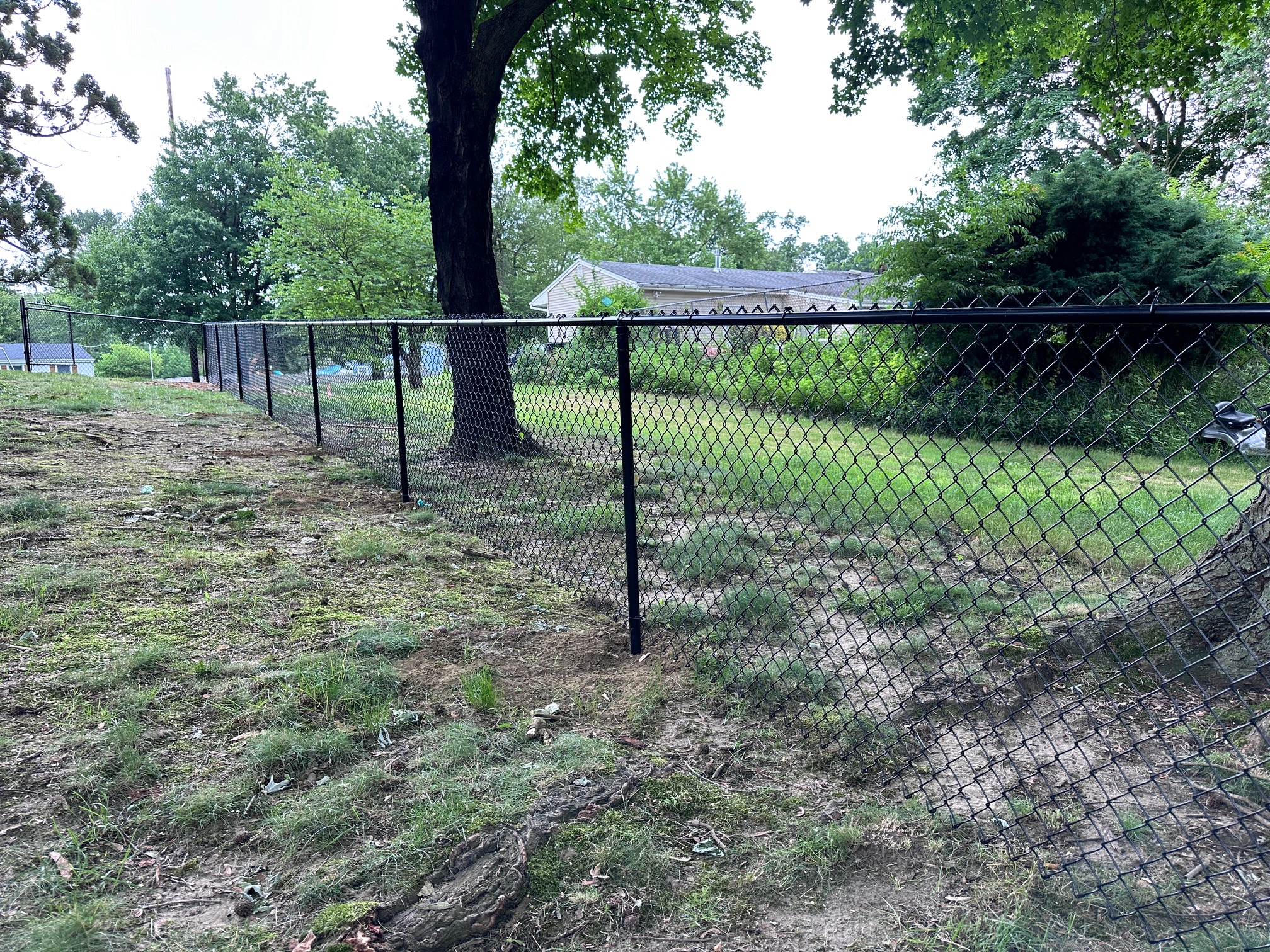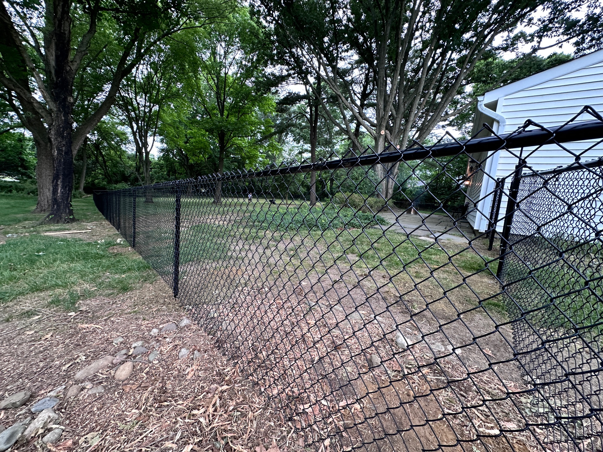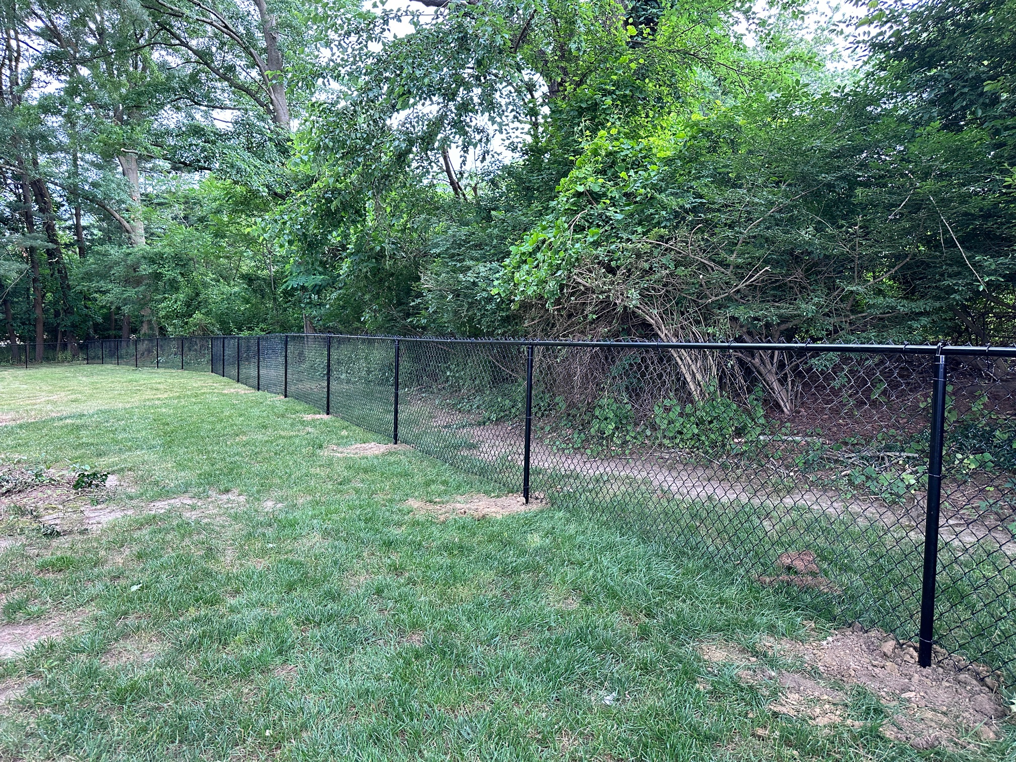 We recently completed a job in Tinton Falls, New Jersey. It consisted of installing 450 feet of 4 ft. high black chain-link fencing with three gates. The customer recently purchased a house and wanted a secure enclosure for his dogs to run around, especially since he lives near a highway for peace of mind.