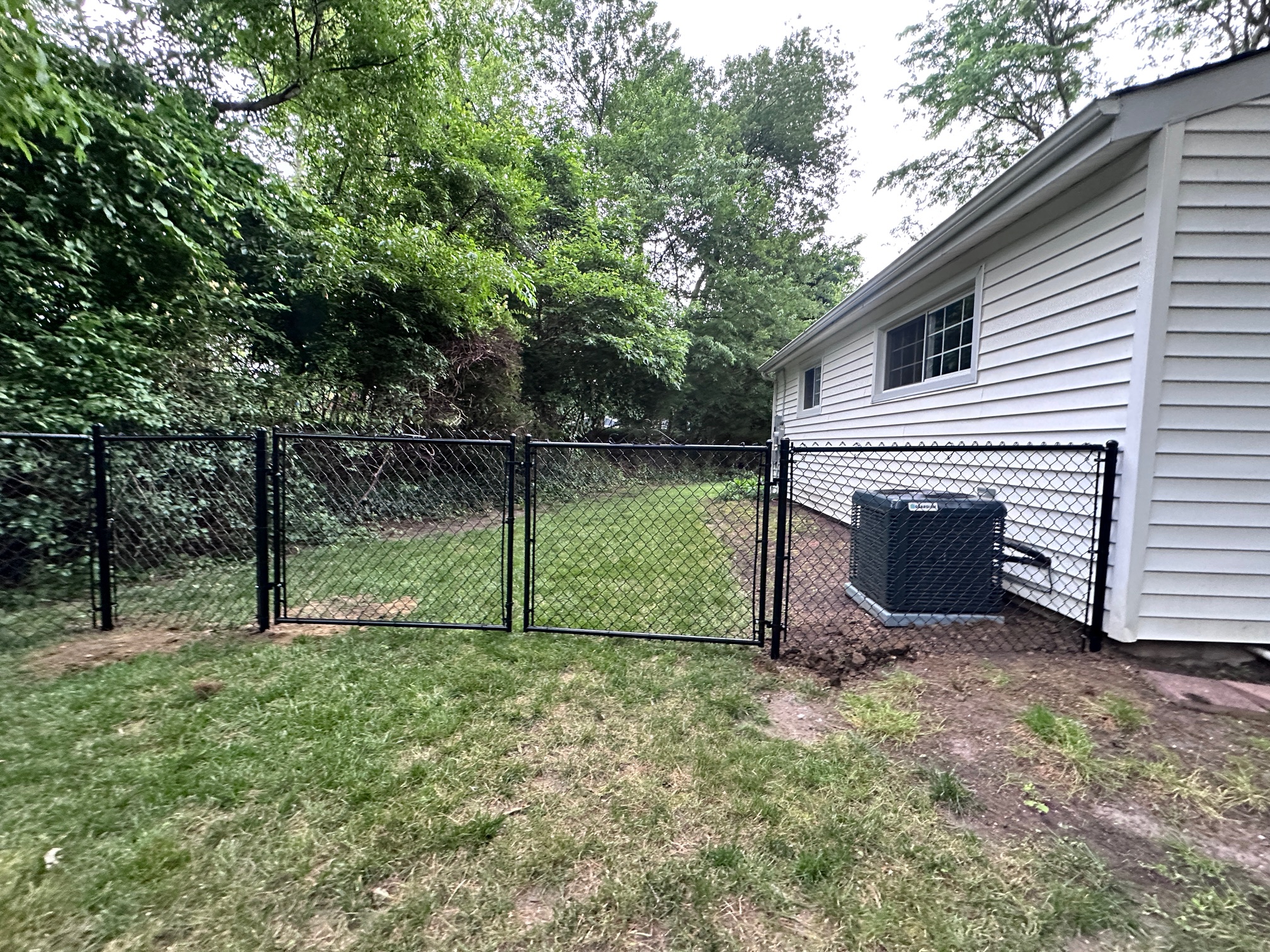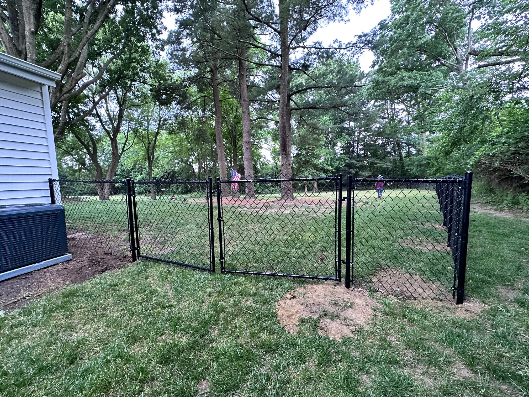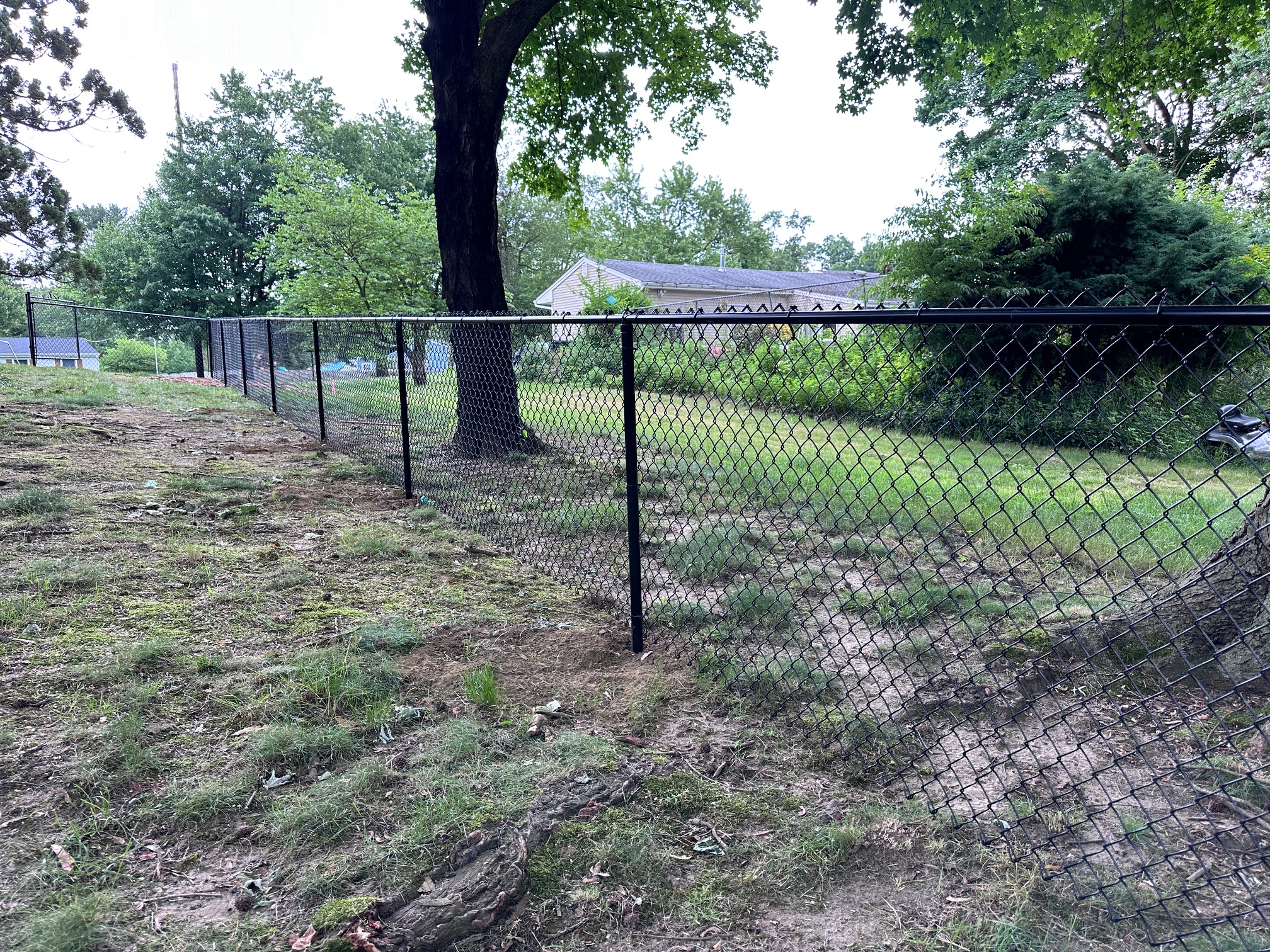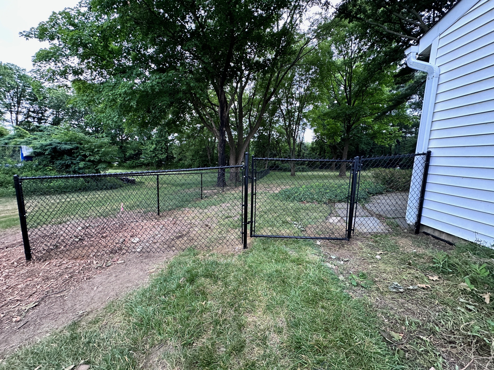 We recently completed a job in Tinton Falls, New Jersey. It consisted of installing 450 feet of 4 ft. high black chain-link fencing with three gates. The customer recently purchased a house and wanted a secure enclosure for his dogs to run around, especially since he lives near a highway for peace of mind.