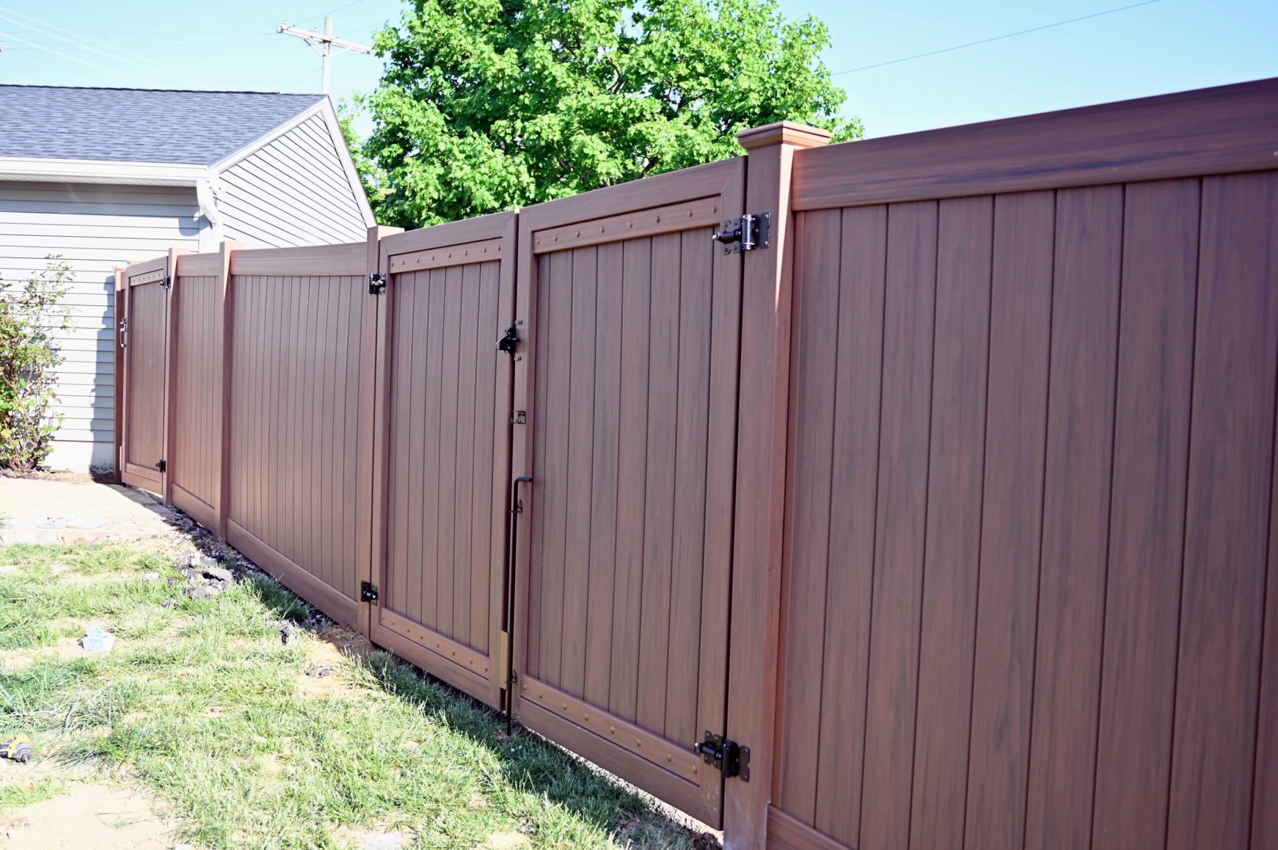 The materials used for this project are proudly made in the USA and come with a 20-year warranty, ensuring peace of mind for the homeowner. To enhance the fence’s durability, we incorporated a metal insert in the lower rail, which adds strength and stability. After placing the order, the materials arrived promptly within two weeks, allowing us to complete the installation within the same week.
