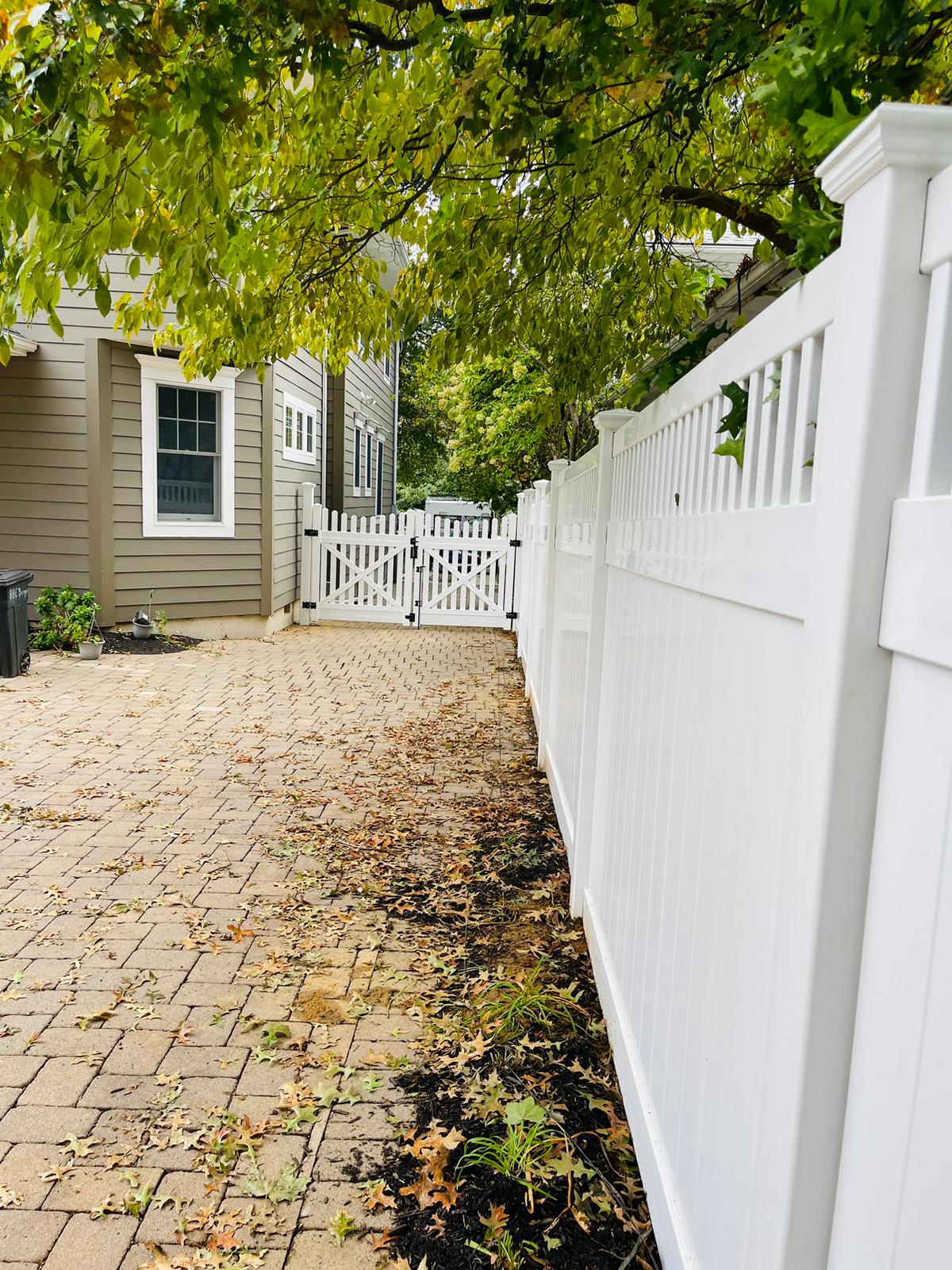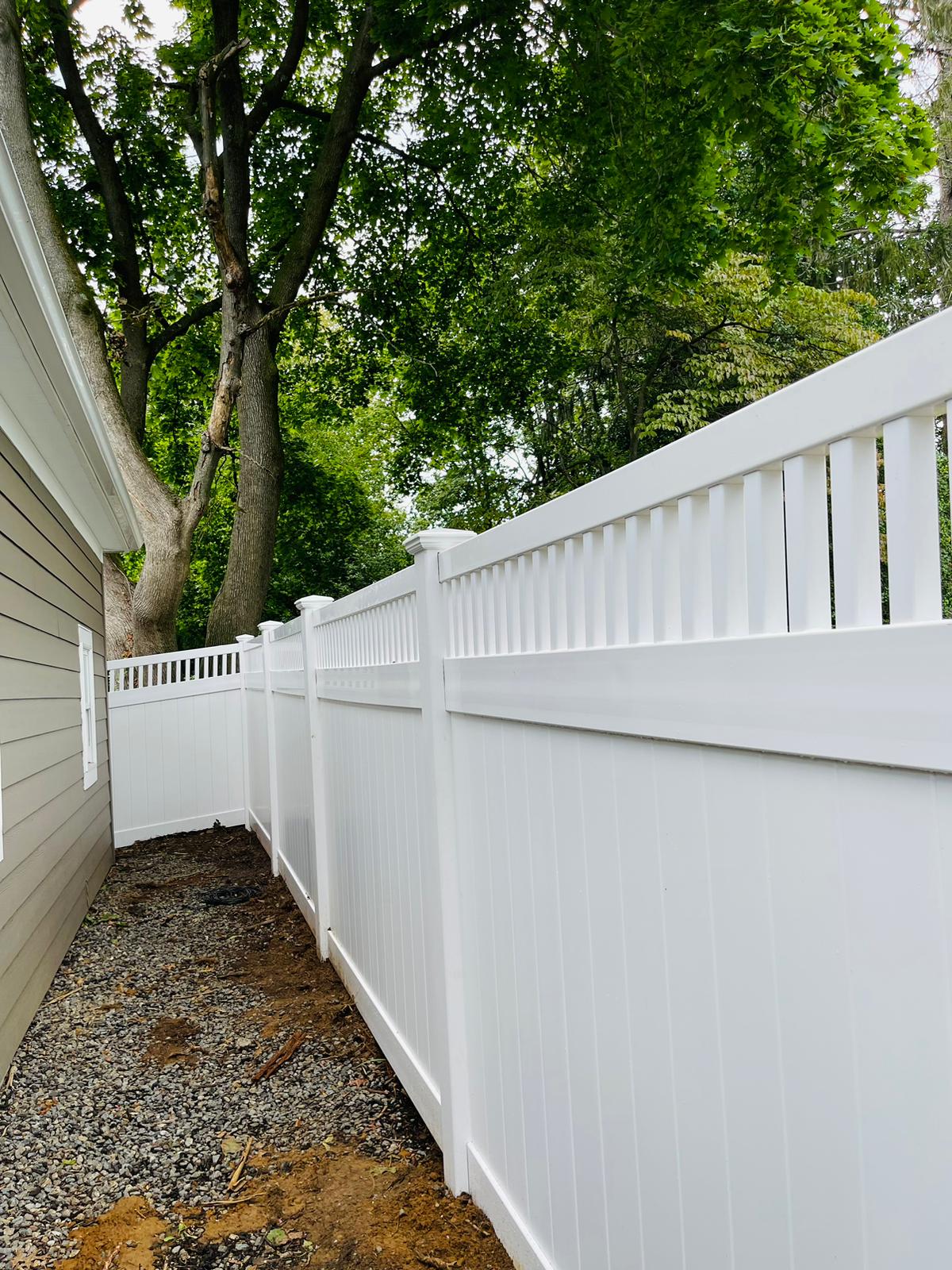 The final result is a beautiful and practical fenced area that not only meets the customer’s requirements but also complements the overall aesthetic of the property. With the new white vinyl fence closed top in place, the homeowner can enjoy peace of mind, knowing his dog is safe and secure, while also having a stylish boundary that enhances the charm of the home.